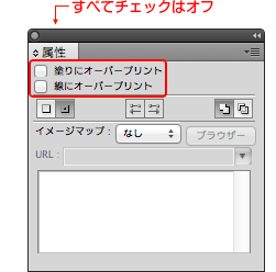 このオーバープリントの設定を行うとモニター画面で見えているデザインや色と印刷結果に差異が出ますので、基本的には使用しないでください。(「ウインドウ」→「属性」→オーバープリントのチェックを外してください)