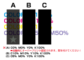 ■黒ベタ部分は必ずK100%ではなく、CMYのいづれかの色に数%加えてください。自動的にオーバープリント変換されるますのでご注意ください。